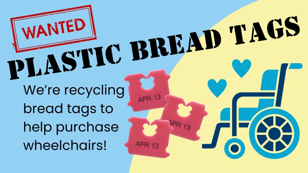 Instead of tossing your bread and vegetable bag fasteners into the trash, bring them to church! We’ll ship them to Danielle Cares for Chairs, a nonprofit that recycles the plastic tags at a specialized plant to earn funds to purchase wheelchairs for children and families in need.