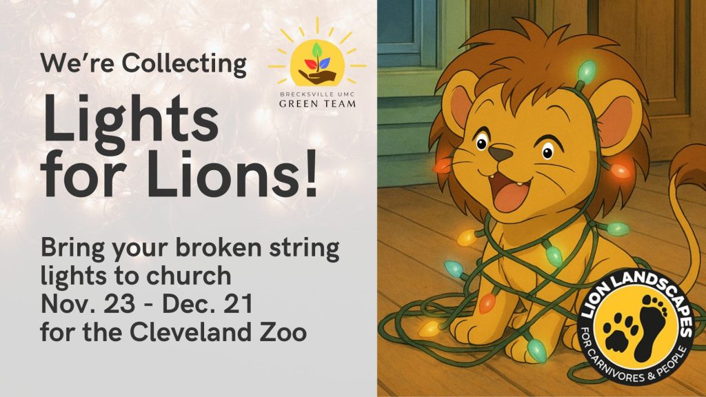 Do you have broken or non-working holiday lights and extension cords? Don’t throw them away! Recycle them through the Cleveland Zoo’s Lights for Lions project. You will help protect lions and cheetahs in Tanzania – and you’ll help care for other parts of God’s creation by keeping valuable resources out of the landfill!